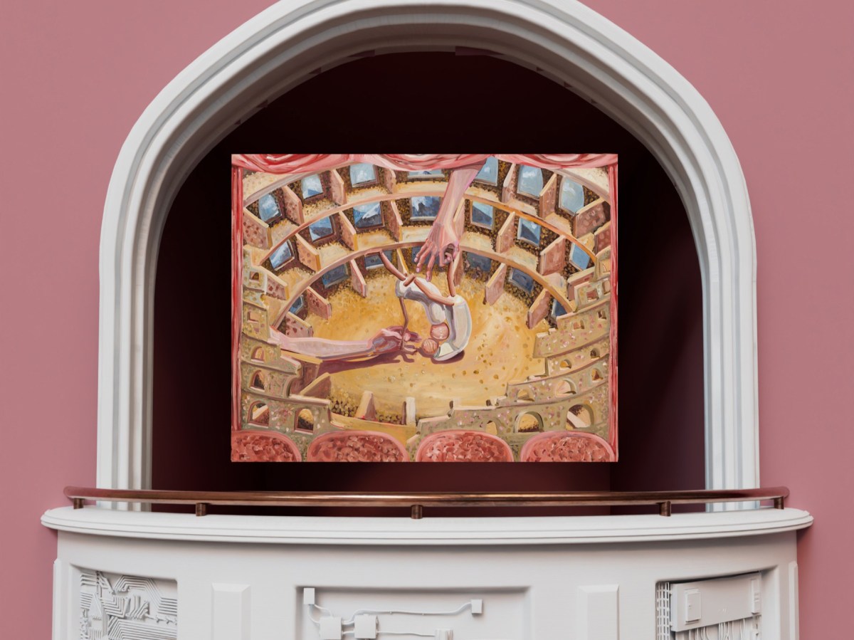 Paintings appear like performers or puppets poised before a digital backstage, where server stacks replace ropes and pulleys. Though the exhibition interrogates simulated storytelling, every element is built by hand: oil paintings, hand-modelled 3D environments, and a 17-metre vinyl set.