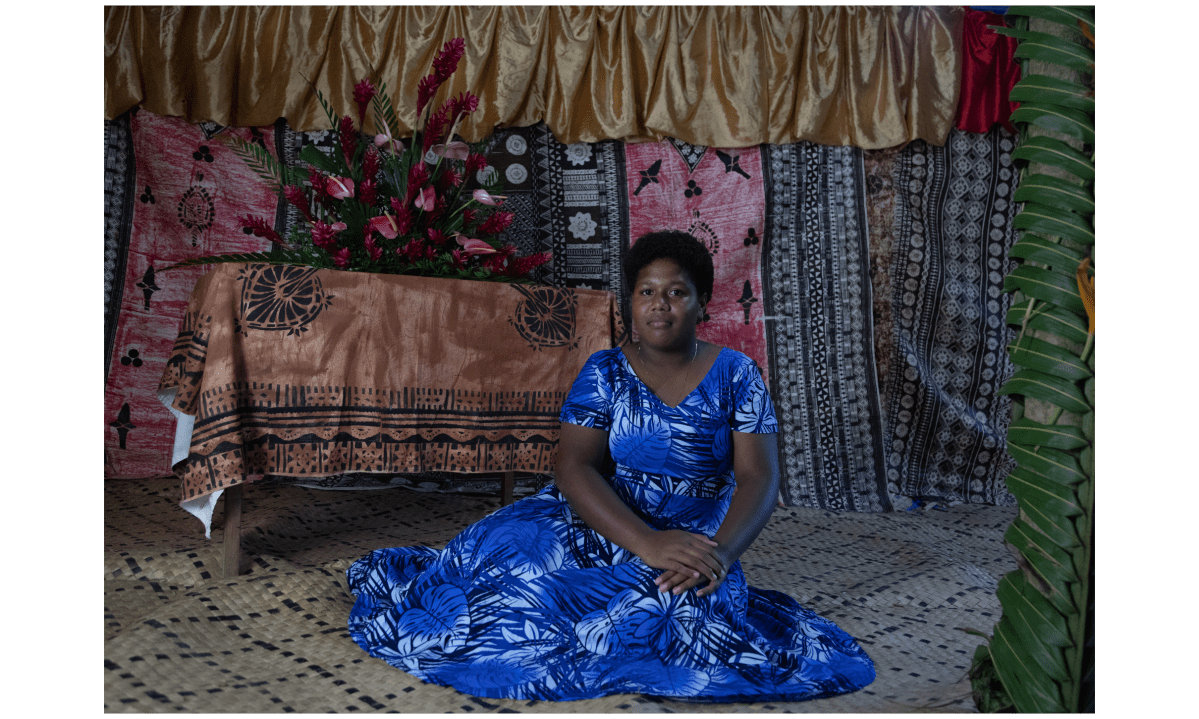 nanuma, meaning “to think or remember collectively” in Fijian, explores familial connection, landscape and shared memory. Reimagining the colonial photograph, the artist collaborates with family members to create staged portraits using hand-made backdrops produced in their village of Vunivaivai, Nausori, Fiji. Through storytelling and place-based knowledge, the work returns agency to family subjects while foregrounding collective histories, memory and ways of understanding carried through land and kinship.