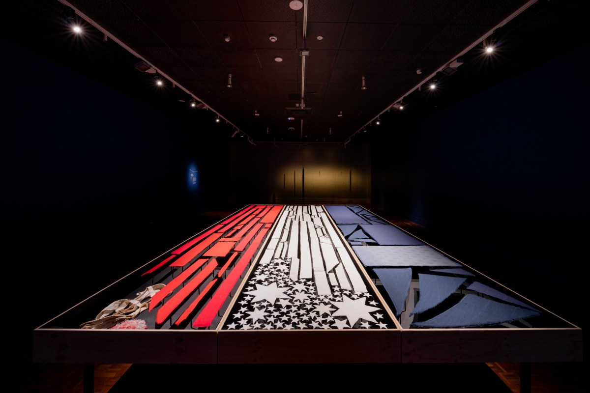 Image details: Sara Morawetz, Cut from the Same Cloth (Disassembly of Empire), 2025, Deconstructed flags. Installation view at Tasmanian Museum and Art Gallery, Hobart Current: Here, 2025. Photo: Rosie Hastie.