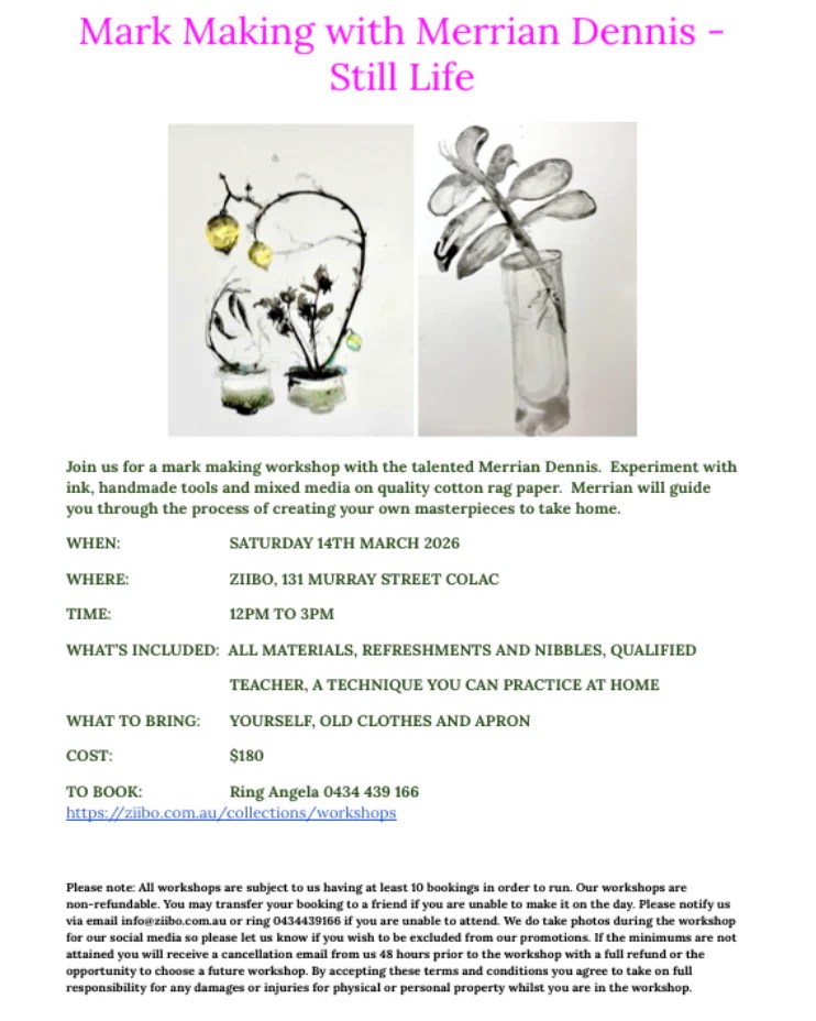 Join an inspiring mark making workshop with the talented Merrian Dennis at Ziibo in Colac on Saturday 14 March.