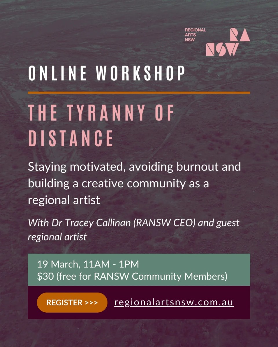 In this workshop, Regional Arts NSW CEO, Dr Tracey Callinan and a guest regional artist (tba), will provide guidance on how to bridge that gap. Over the course of 2 hours, you will learn: