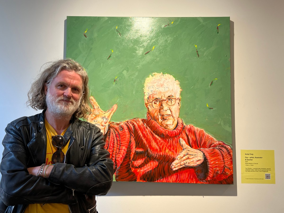 Featured image: Andy Ferg pictured next to one of his his portraits ‘Fay – artist illustrator & teacher’ 2025. Mixed media on canvas. 110 x 110cm.