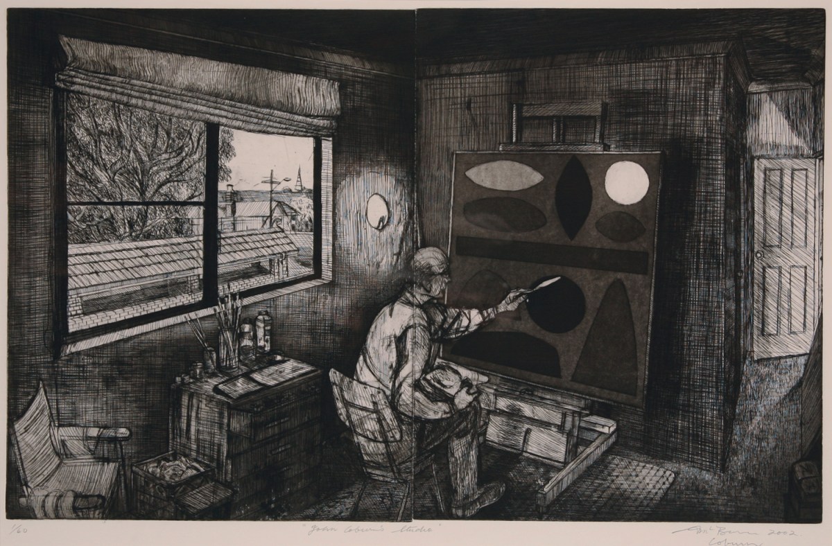 Image: Ron MCBURNIE, b.1957, Brisbane, Queensland, John Coburn’s studio 2002, etching, aquatint and roulette on paper, ed. AP, 51.2 x 81.4 cm, donated through the Australian Government’s Cultural Gifts Program by Ron McBurnie, 2006