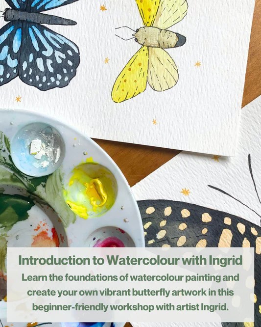 Join artist and illustrator Ingrid for this 3-hour beginners watercolour and fineliner workshop creating some joyful moths and butterflies!