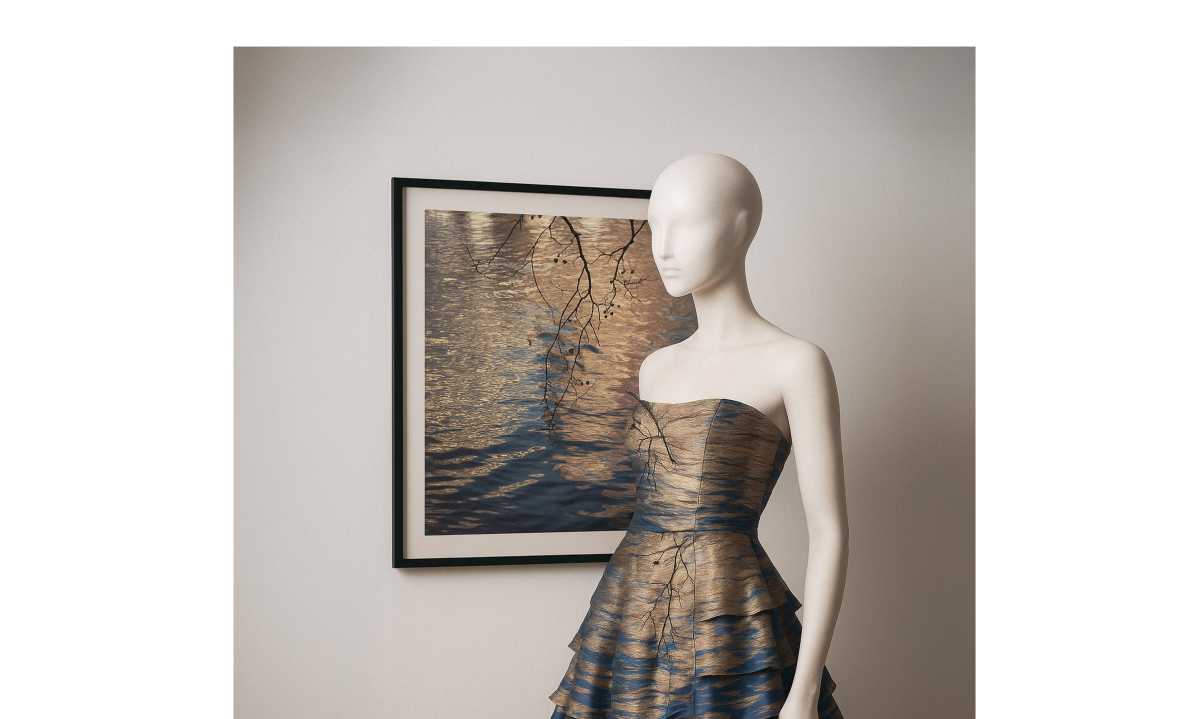 Her other great love is gowns and couture. How then to combine the two? She sought out renowned couture designer, Linda Britten. They have worked together on three projects combining Pam’s photographs and Linda’s couture designs. Pam is passionate about photography being printed on fabric, then recreated into a garment to bring the photograph and perhaps a memory back to life.
