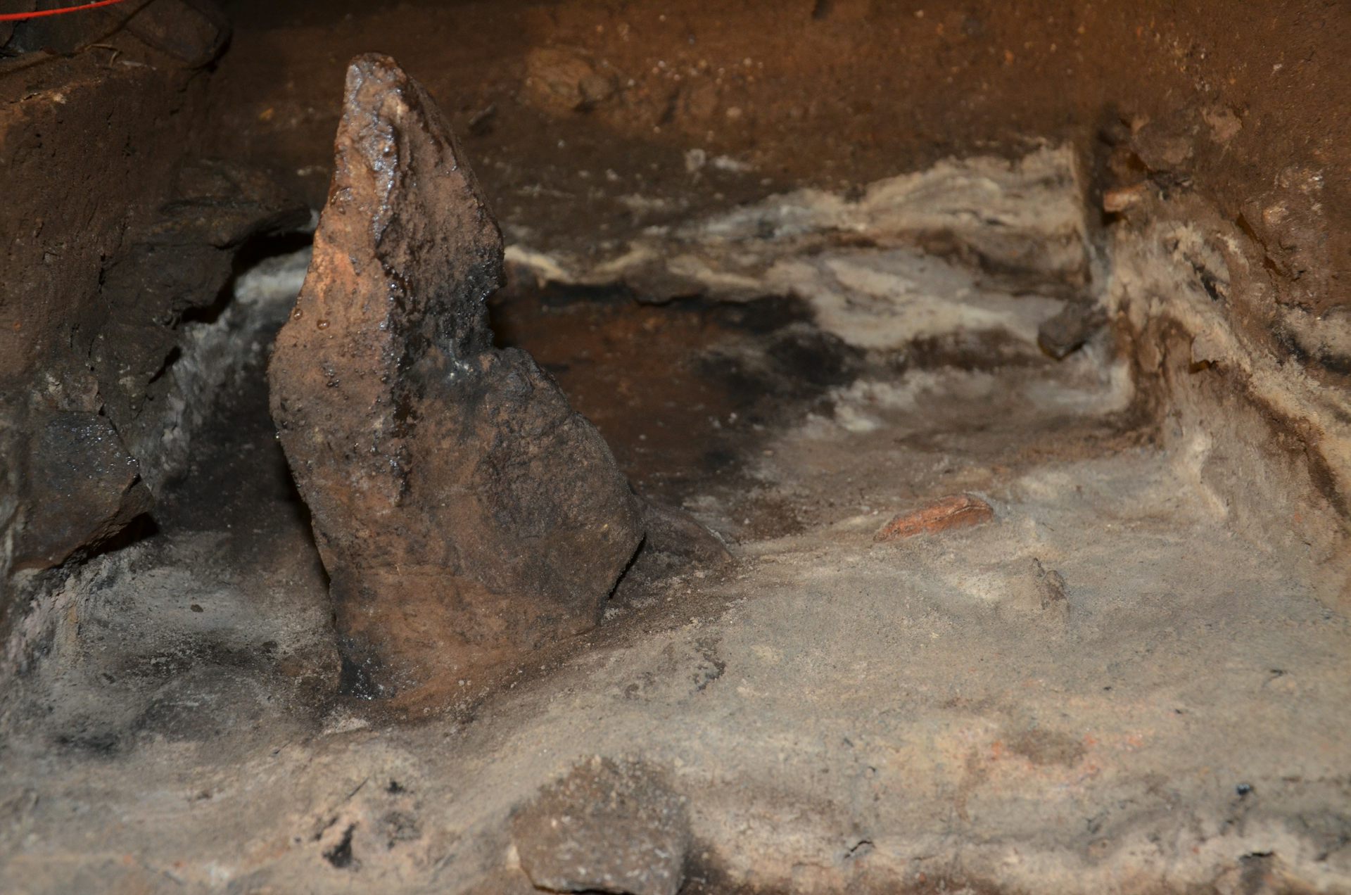 The 2,000-year-old standing stone, pictured during the 2019 Cloggs Cave excavations. Layers of ash – the remains of many fires — can be seen at the foot of the stone and in the wall of the excavation. Photo Bruno David.