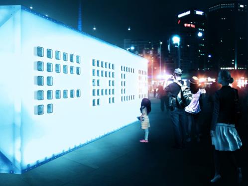 Developed by The Cloud Lab, FACEWALL is both a social network experiment and an interactive art and light installation comprising digital portraits. Small custom monitors – or lamps – spell out the word FACE, which are ever-changing as visitors upload their own image via a mobile app.