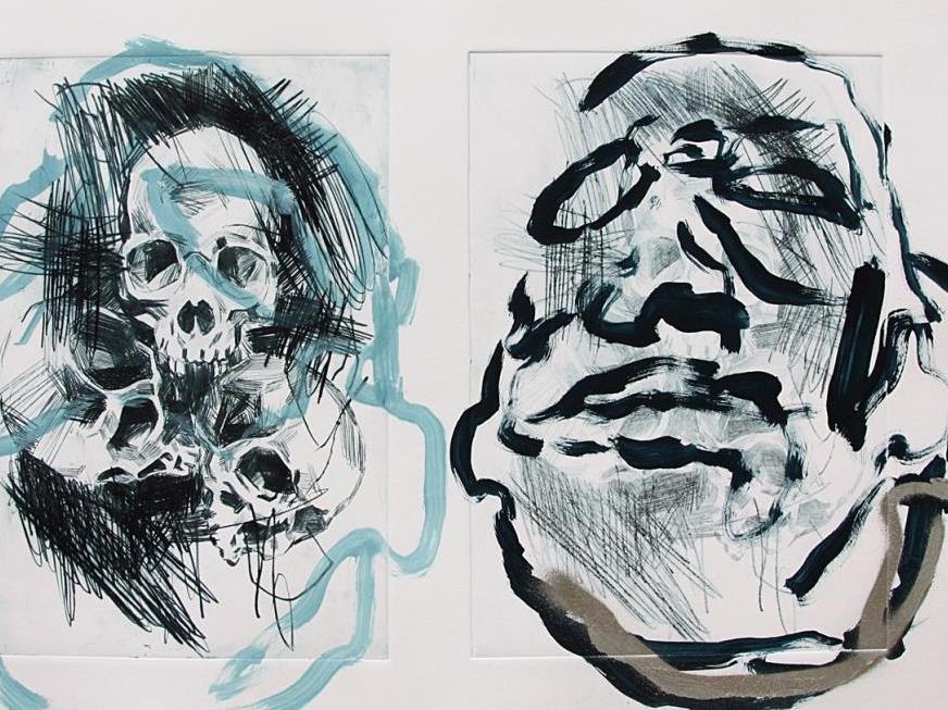 Image: Burn out don’t fade away #1 by Andy Quilty. Dry point, acrylic and aerosol on rag paper, 38 x 55.5cm.