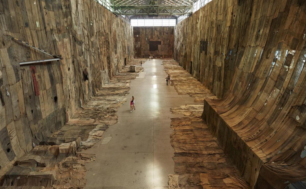 Ibrahim Mahama, No Friend but the Mountains 2012-2020, charcoal jute sacks and mixed media. Installation Installation view (2020) for the 22nd Biennale of Sydney, Cockatoo Island. Courtesy the artist; White Cube and Apalazzo Gallery. Photo: Zan Wimberley.