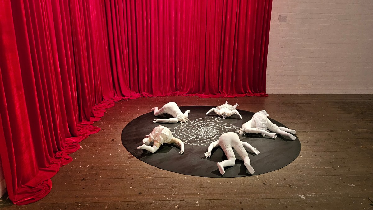 Holly Block’s eerie and captivating two-metre installation, Once such a pretty girl, they would say, whatever have you become?, shares a space with the stop-motion film projection of Lucy Crowe, titled i think that i think too much. The works speak to each other in their surreal aesthetic and shared anxieties. Block’s dolls bury their heads into the ground with the backdrop of red velvet curtains, seemingly engaged in some sort of forced ritual. Meanwhile, Crowe constructs fragments of unease through dark tones and raw lines.