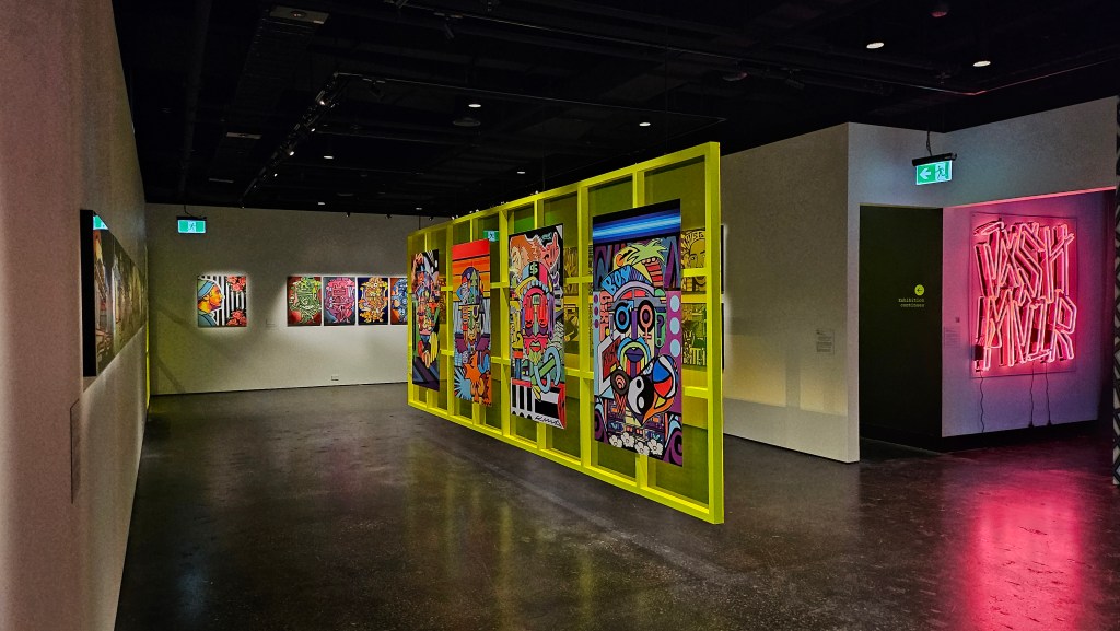 Seeing the calibre of Muir’s works and indications of what could have manifested in years to come lead to a bittersweet moment in the exhibition. A 2018 quote from Muir leaps out against the yellow wall on level three – ‘I can’t say goodbye to art,’ he said, ‘who am I kidding, I’m still yet to create the best work of my life.’