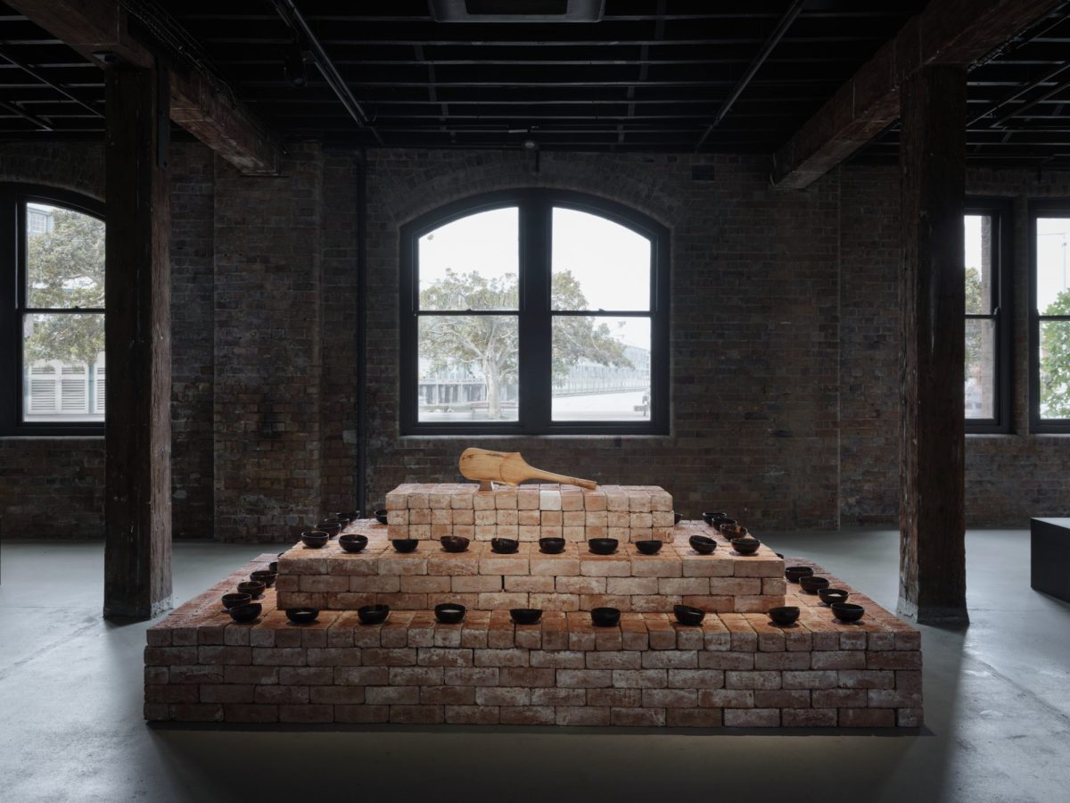 In this second version, Heta’s The Body of Wainuiatea (2024) is split in half with an ‘atea‘ positioned in the atrium of Artspace. Earthen bricks are laid around an existing wooden pillar. Using the sun, understated black wooden seats are set at ‘cardinal points‘. From the ceiling above, white woven fabric banners are draped. They honour the marriage between the sky father, Ranginui, and the goddess of the ocean, from whom the artwork takes its name. This installation, inspired by a creation myth, resembles a stage set for a ritual. Yet, it exudes a reverence while materially unoccupied.