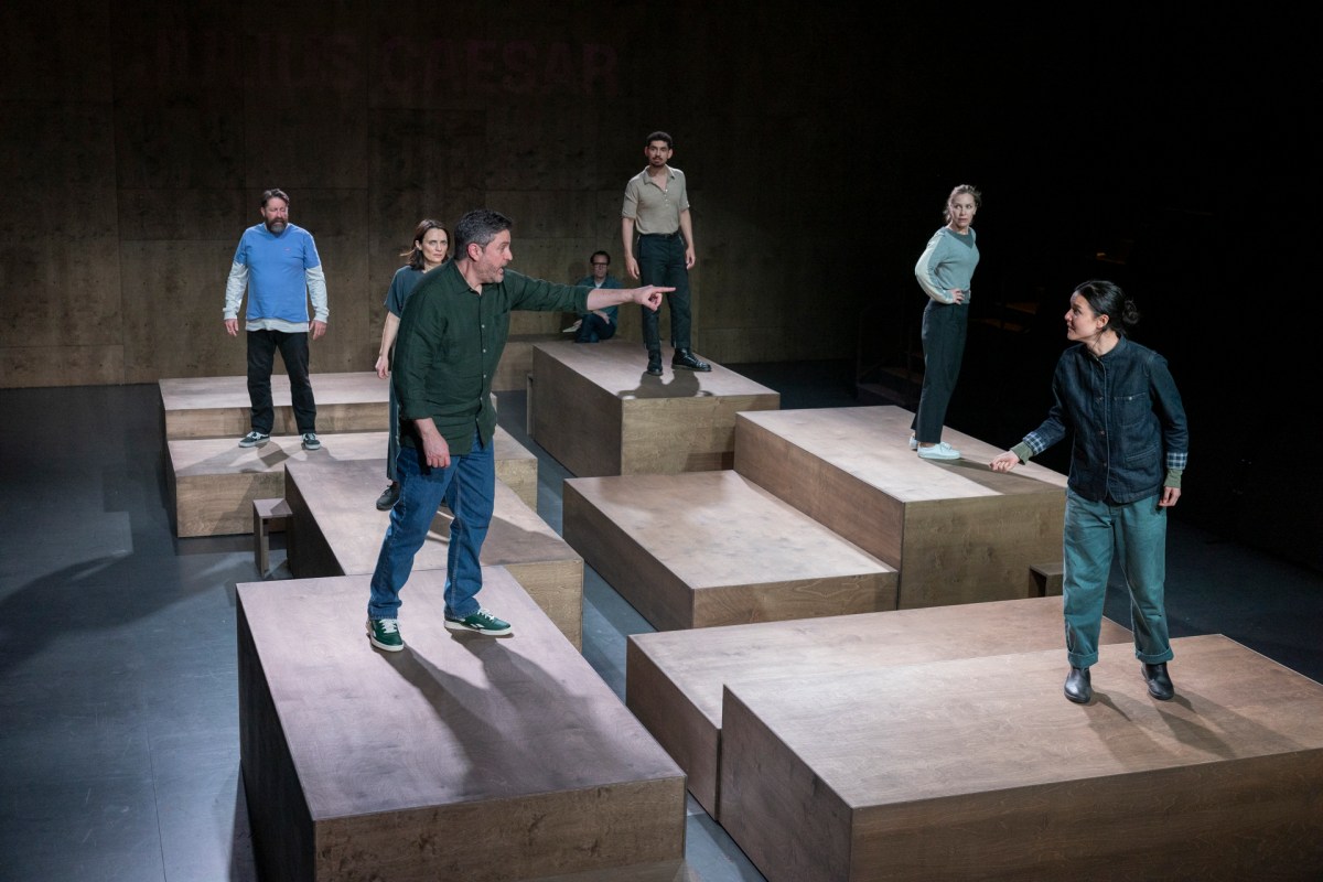 The six actors he calls upon to bring various scenes to life present their soliloquys atop several large boxes or crates placed in the centre of the stage, which is configured in the round.